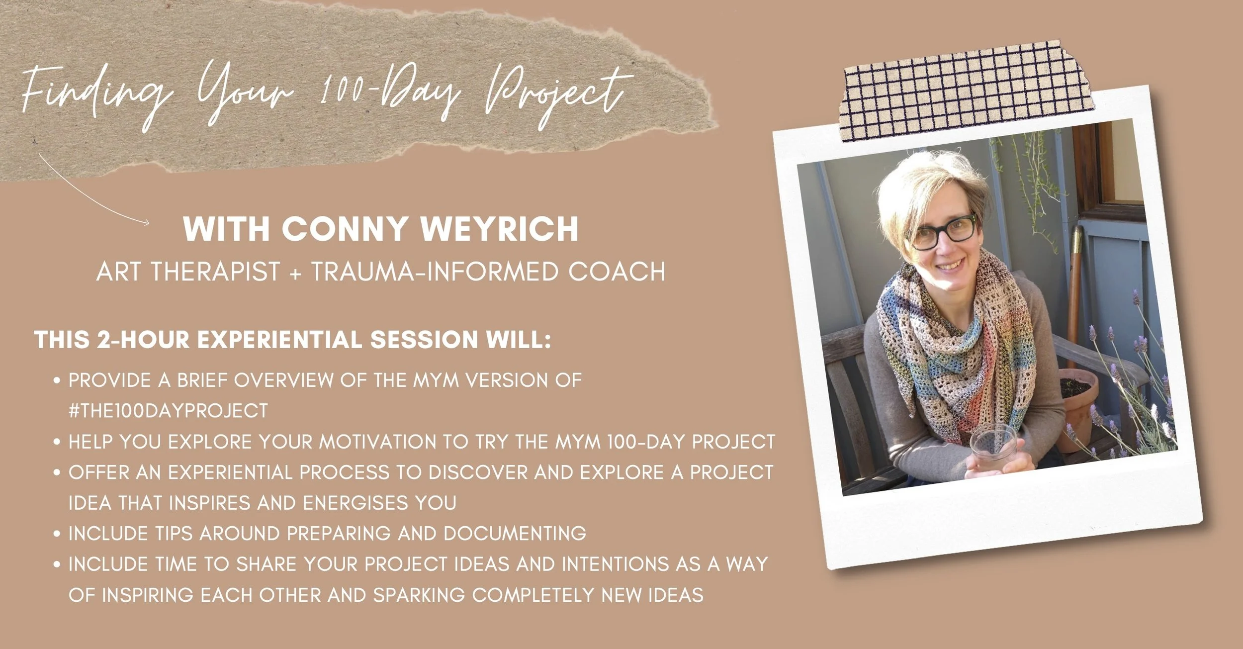 In 2022, for the first time, me and a group of Members took part in the MYM 100-Day Project, where we each did our own personal activity for 100 days (or as close to 100 days as we could manage!). Art Therapist and Trauma-informed Coach Conny Weyrich is a MYM Member and, thanks to her, Members benefitted from brilliant input and support in helping them choose the focus of their project.