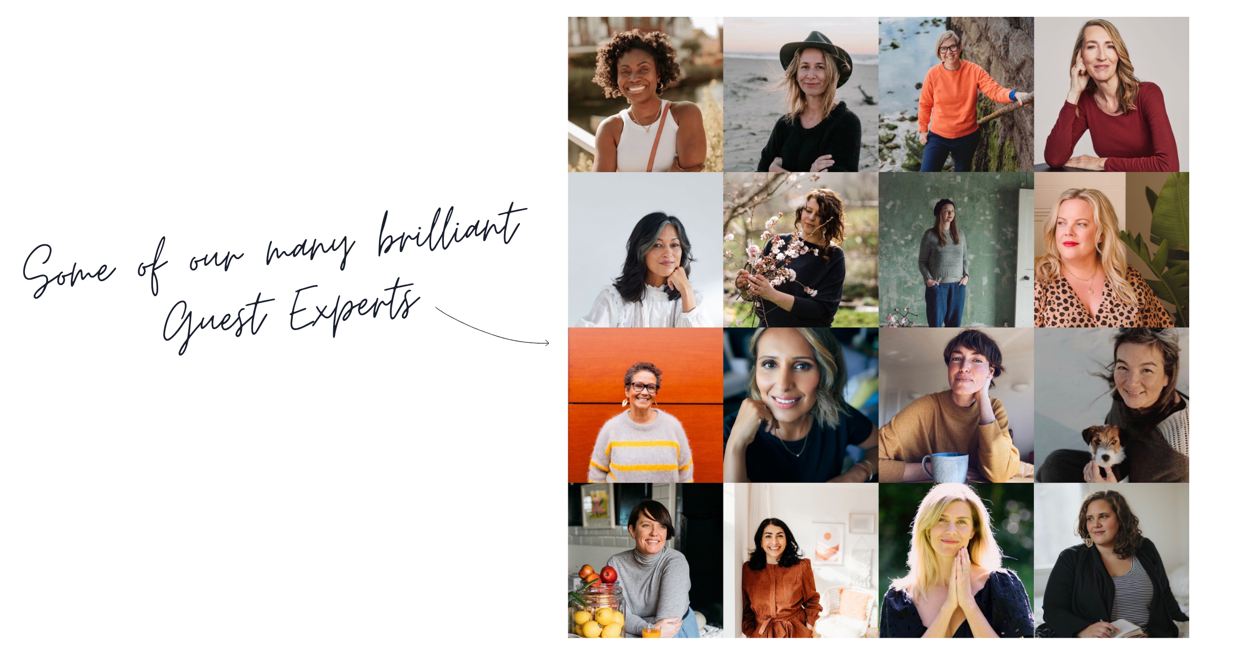 Pictured above from left to right starting from the top row are Tamu Thomas; Sara Duigou; Katie Treggiden; Professor Sonja Lyubomirsk, PhD; Nahid de Belgeonne, Dr Grace Alexander; Hannah Bullivant; Professor Phillips Diedrichs, PhD; Donna Lancaster; Dimple Mukherjee; Suzy Darke, PhD; Pen McKinley-Rodgers; Karen Newby; Atifa Balding; Nicola Duffell; and Mara Glatzel. And there are dozens more brilliant teachers who we have spent time learning from on topics as wide-ranging as: